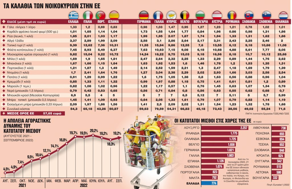 Μια σύγκριση το αποδεικνύει. Στο ίδιο καλάθι 19 προϊόντων της Numbeo (σε μέσες τιμές), ανάμεσά τους γάλα, τυριά, κρέας, φρούτα, ψωμί κ.τ.λ., ο Ελληνας καλείται να πληρώσει 54,3 ευρω με κατώτατο μισθό τα 755 ευρώ τον μήνα, όταν ο Γερμανός πληρώνει 59,59 ευρώ (με κατώτατο μισθό τα 1.621 ευρώ), ενώ ο Ισπανός με κατώτατο μισθό 1.126 ευρώ για το ίδιο καλάθι πληρώνει 50,87 ευρώ και ο Πορτογάλος με 823 ευρώ κατώτατο μισθό πληρώνει 43,26 ευρώ.