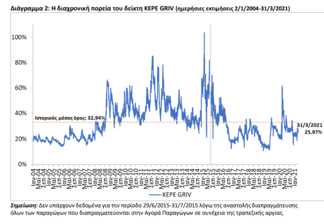 Η τιμή του δείκτη KEPE GRIV αυξήθηκε τον Μάρτιο του 2021 φτάνοντας το 25,97% στις 31/3/2021 από 23,86% στις 26/2/2021 (Βλ. Διάγραμμα 2). Ο δείκτης παρέμεινε σε επίπεδα χαμηλότερα του ιστορικού μέσου όρου του (από τον Ιανουάριο του 2004) για την ελληνική αγορά, ο οποίος είναι στο 32,94%.