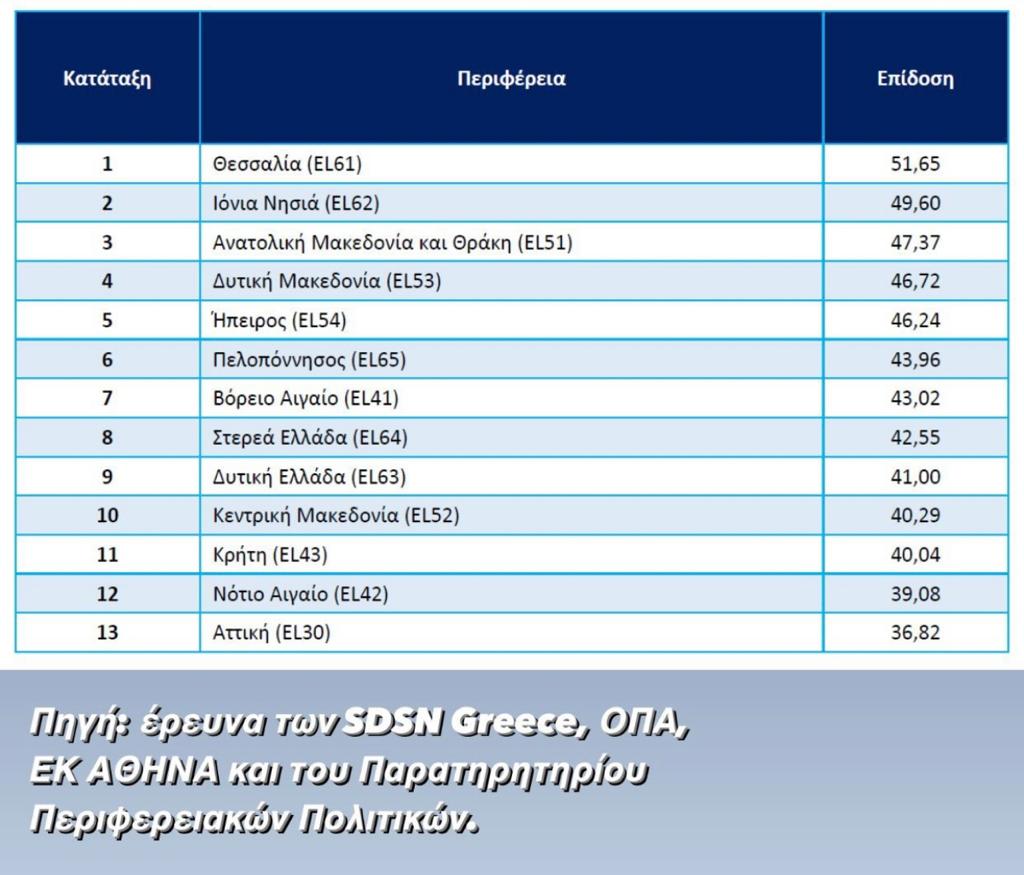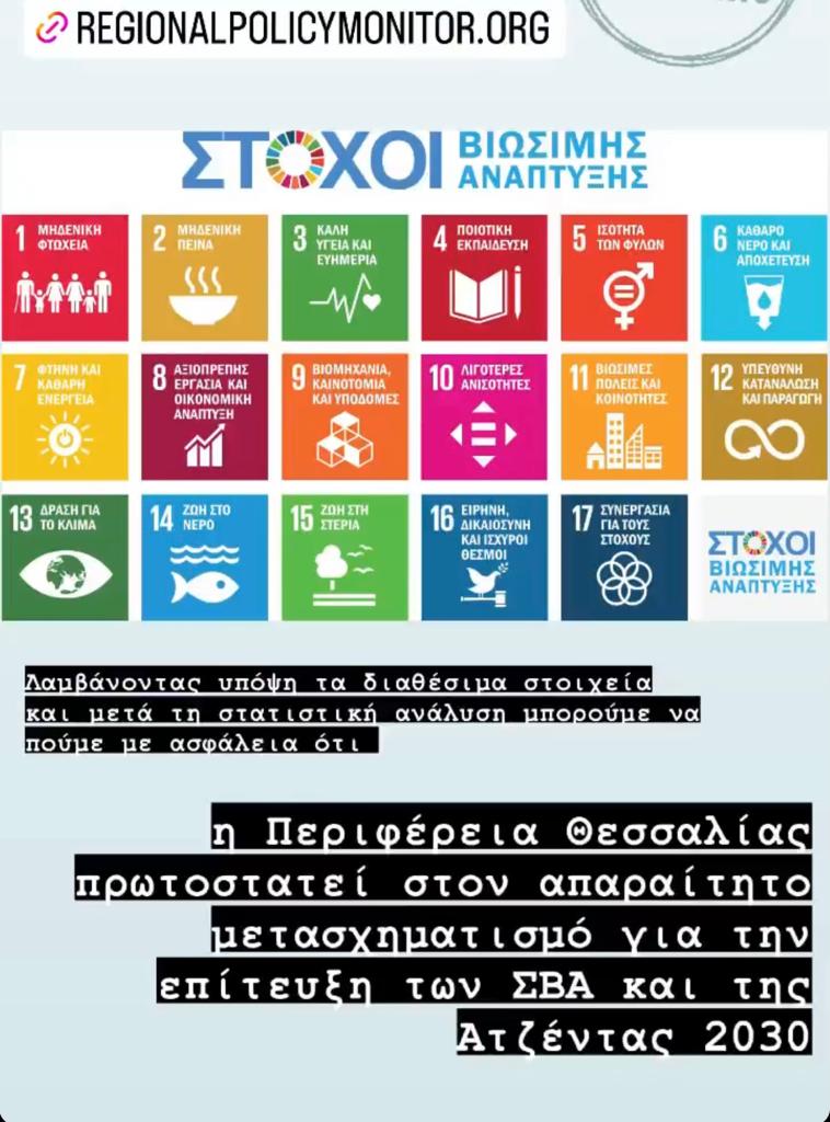 Παράλληλα γίνονται και έρευνες από Πανεπιστήμια και Ερευνητικά Κέντρα σε συνεργασία με το Παρατηρητήριο Περιφερειακών Πολιτικών, όπου φαίνεται ότι η Περιφέρεια Θεσσαλίας καταγράφει τη μεγαλύτερη πρόοδο, μεταξύ όλων των Περιφερειών της χώρας, στην επίτευξη των 17 Στόχων Βιώσιμης Ανάπτυξης του ΟΗΕ.