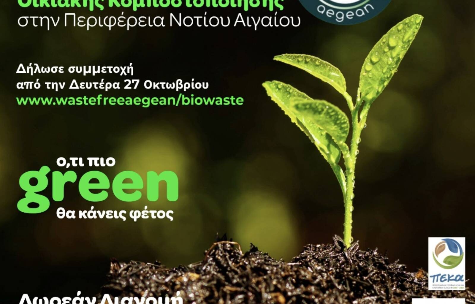 Ό,τι πιο green θα κάνεις φέτος ξεκινά την Δευτέρα 27 Οκτωβρίου 2025, στις 09:00, όπου οι πολίτες της Περιφέρειας Νοτίου Αιγαίου μπορούν να δηλώσουν συμμετοχή στο μεγαλύτερο πρόγραμμα οικιακής κομποστοποίησης και να διεκδικήσουν την απόκτηση του δικού τους οικιακού κομποστοποιητή εντελώς δωρεάν.