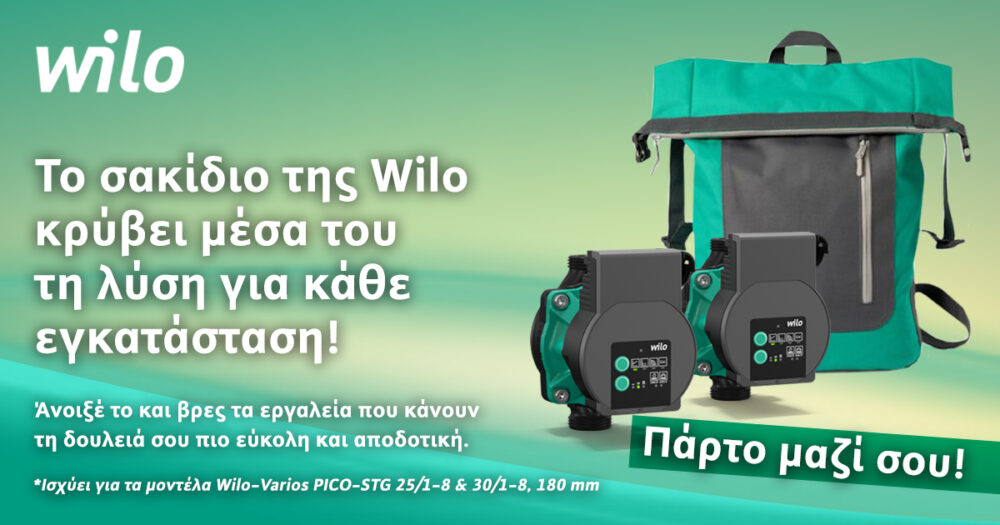 Καλύπτοντας το 85% όλων των εφαρμογών αναζητήστε στα καταστήματα το Wilo Backpack μέσα στο οποίο οι Wilo-Varios PICO-STG 25/1-8 & 30/1-8,180mm είναι ο απόλυτος εξοπλισμός για κάθε εγκατάσταση! Η προσφορά αυτή ισχύει μέχρι εξαντλήσεως των αποθεμάτων και ισχύει μόνο για τα συγκεκριμένα μοντέλα κυκλοφορητών.